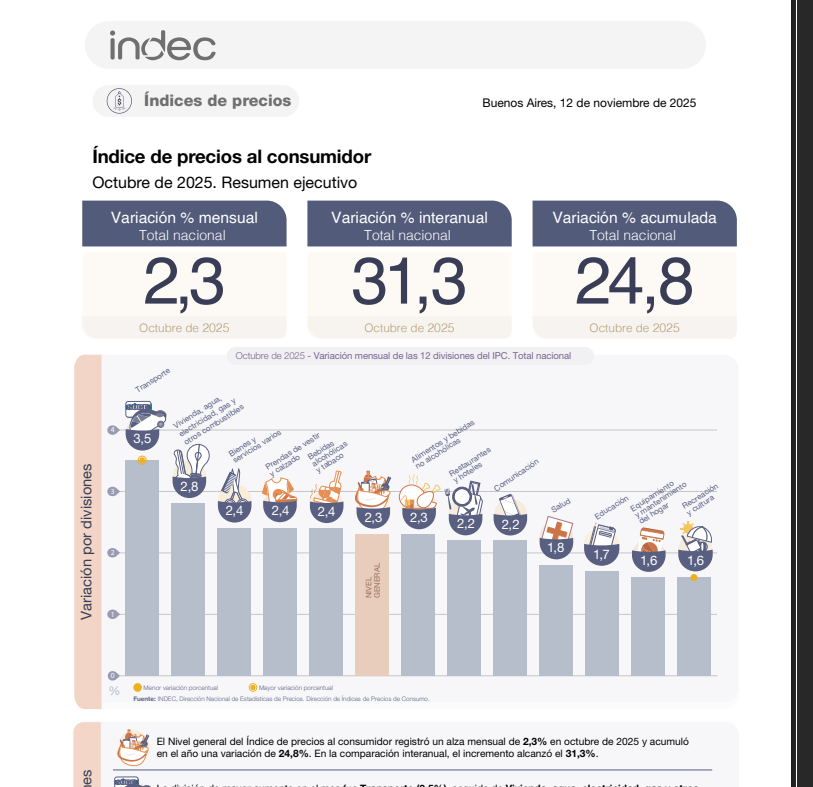 La inflación del mes de Octubre, según el INDEC fue de 2.3%