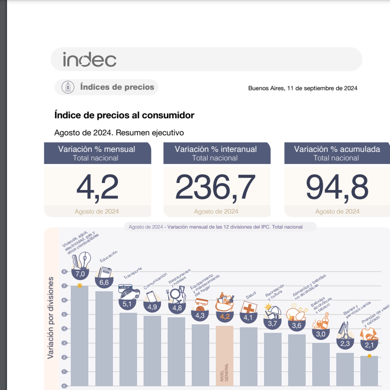 La inflación del mes de Agosto, según el INDEC, fue del 4,2%.